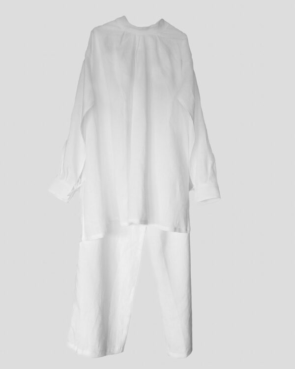 Hvidt sæt i 100 % hør. Skjorten er syet med rund fast krave, og små plisseringer langs kraven som skaber vide, og forsynet med to bløde bindebændler. Skjorten er forsynet med et bredt bærestykke over hver skulder, samt åbne lange ærmer med let rundede manchetter. Ærmerne er forsynet med bindebændler ved manchetterne. Skjorten er syet uden rygstykke, bukserne er syet uden lukning bagtil. De kan gøres kortere, ved at klippe og stryge en fold, hvis ikke længden passer.